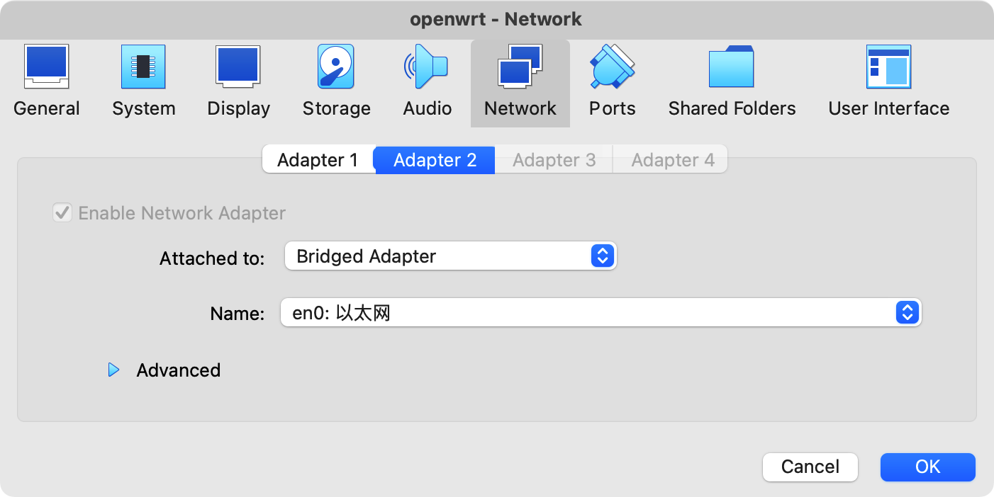 2)启用网卡2,连接方式选桥接网卡,名称选本机上能访问外网的网卡