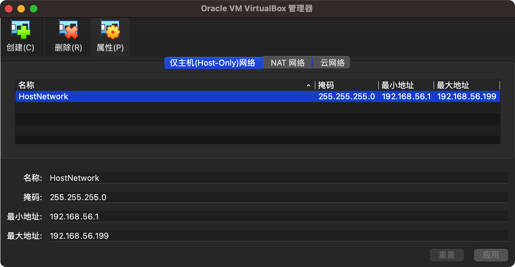 在VirtualBox中新建HostNetwork(Host-Only网络),网段为192.168.56.0/24