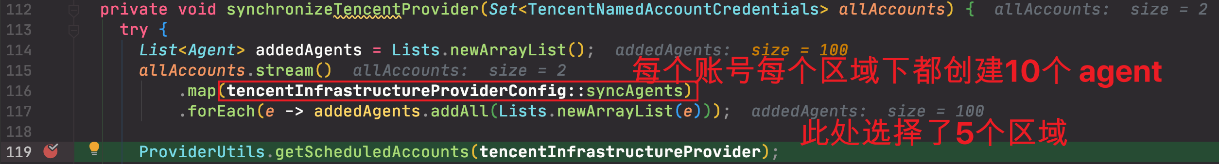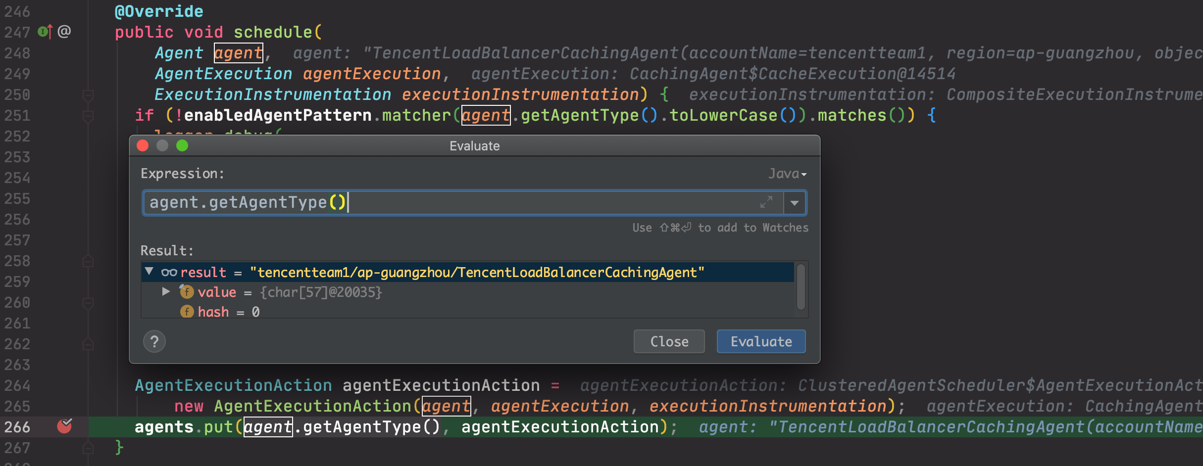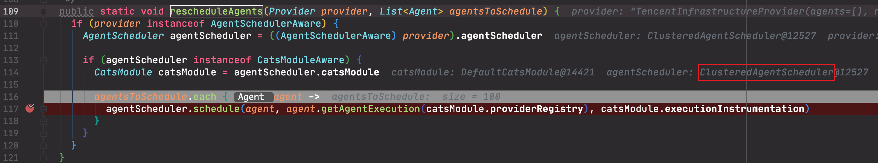 上面的 agentScheduler 的实现类为 com.netflix.spinnaker.cats.redis.cluster.ClusteredAgentScheduler,具体操作就是将待添加的 100 个 agents 全部放到其中的 map 中,并以 accountName+region+className 作为 key。