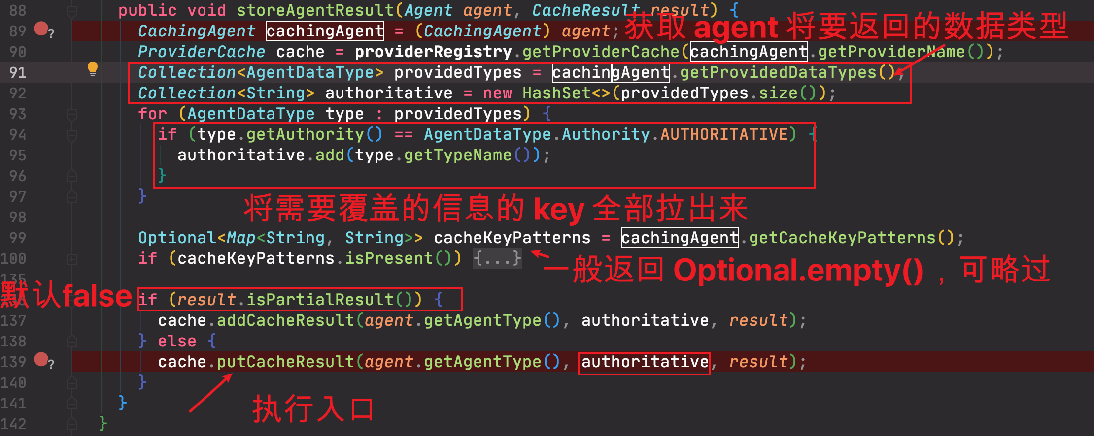 在这一部分的代码中,逻辑非常多且略带抽象,因为这一部分代码,是所有 agent 拉完数据后,进行存储的统一模板代码,有部分代码处理个别 agent 数据的情况出现。但是化繁为简,它的目的就是做存储,并且此时的存储方式,有两种,资源对应 AUTHORITATIVE;关联数据对应 INFORMATIVE。抛开 agent 的差异,专注到存储的逻辑中,它的逻辑其实也很明了。 存储数据的位置在:CacheingAgent.java 的内部类 CacheExecution 的 executeAgent() 的最后一行,如下: