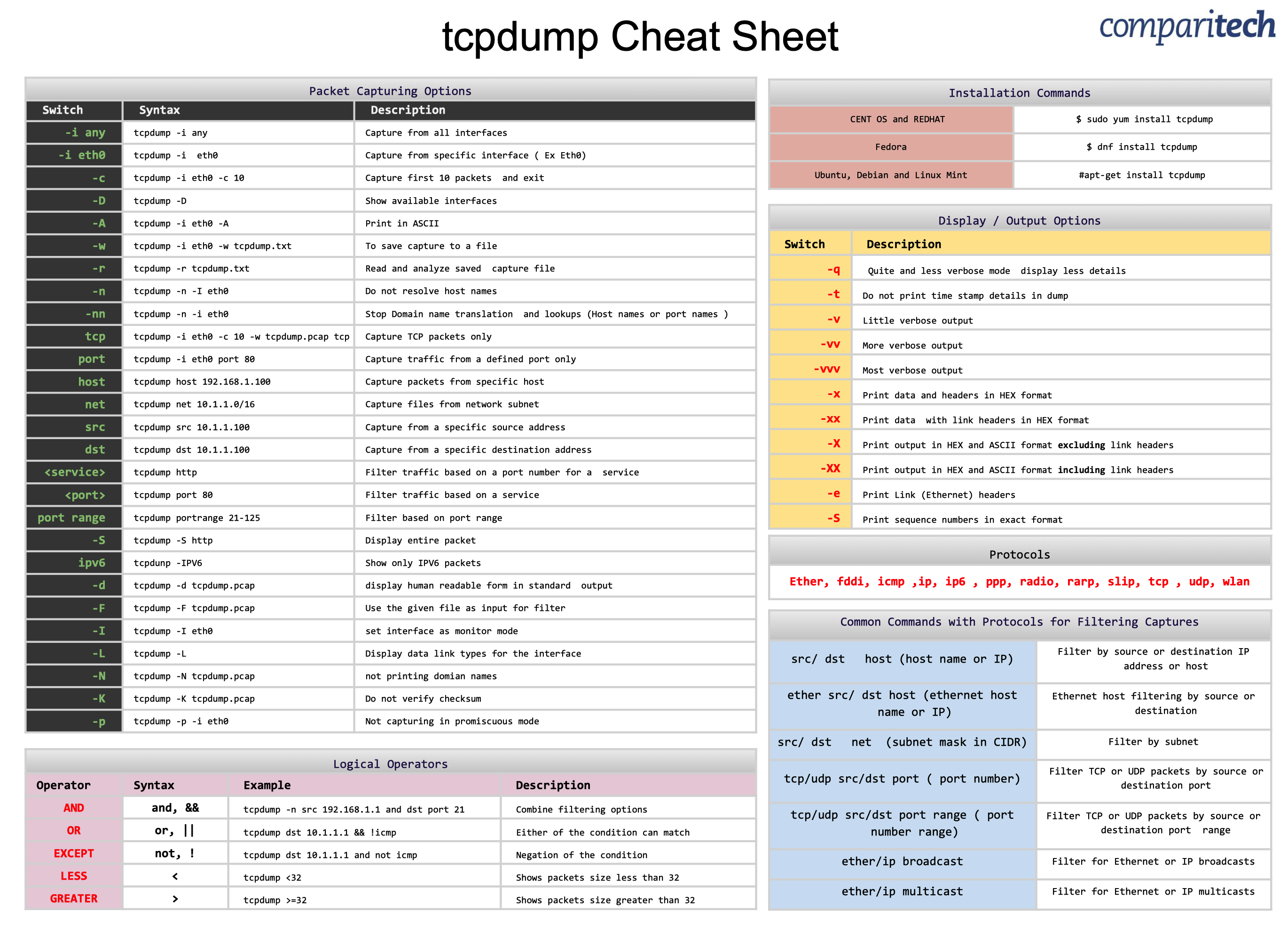 Packet Capturing OptionsSwitchSyntaxDescription-i anytcpdump -i anyCapture from all interfaces-i eth0tcpdump -ieth0Capture from specific interface ( E